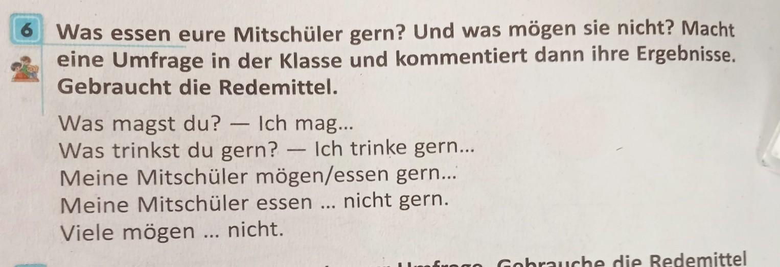 Meine Mitschüler essen gern.... (потрібно написати,що люблять твої однокласники) наприклад Salat