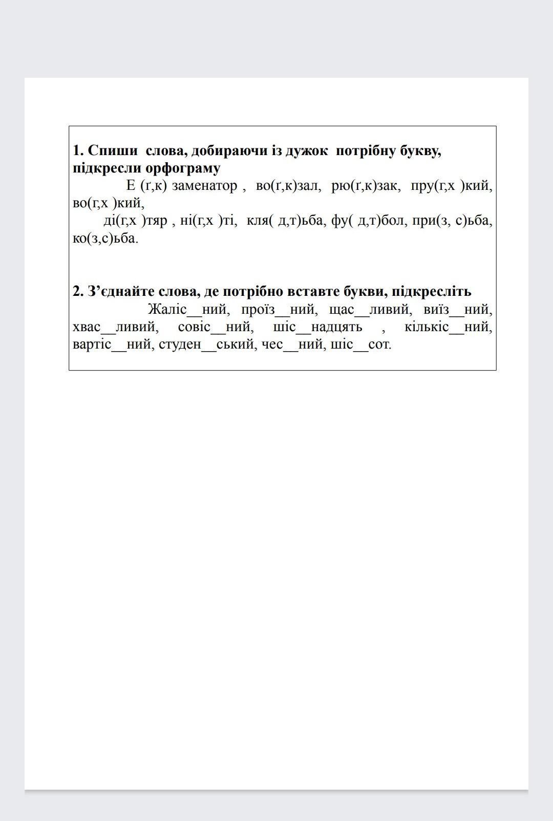 1. Екзаменатор, вокзал, рюкзак, пухкий, вогкий, дігтяр, нігті, клятьба, футбол, призьба, косьба.