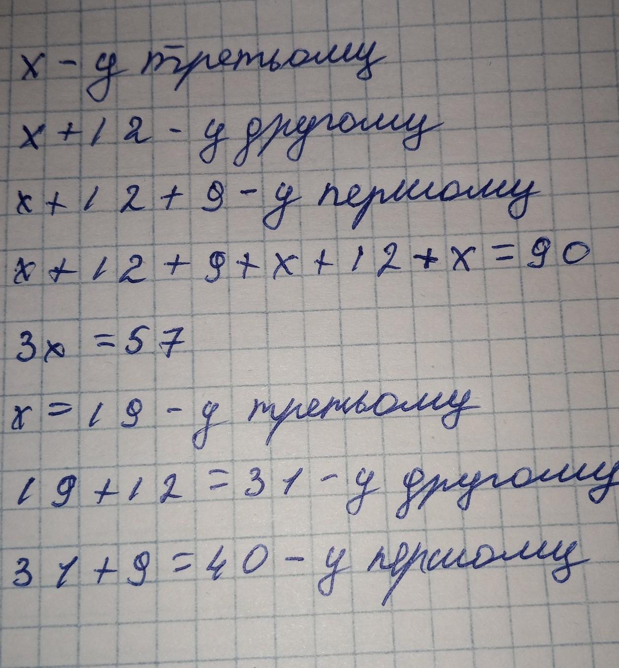 У трьох мішках 90 жетонів для атракціонів.Відосо,що в першому мішку на 9 жетонів більше,ніж у другому,а в другому мішку на 12 жетонів більше,ніж у третьому.Скільки жетонів у кожному мішку?СРОЧНО