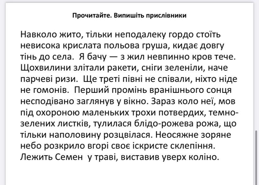 Навколо жито, тільки неподалеку гордо стоїть невисока крислата польова груша, кидає довгу тінь до села. Я бачу 3 жил невпинно кров тече. - Щохвилини злітали ракети, сніги зеленіли, наче парчеві ризи. Ще треті півні не співали, ніхто ніде не гомонів. Перший промінь вранішнього сонця несподівано заглянув у вікно. Зараз коло неї, мов під охороною маленьких трохи потвердих, темно- зелених листків, тулилася блідо-рожева рожа, що тільки наполовину розцвілася. Неосяжне зоряне небо розкрило вгорі своє іскристе склепіння. Лежить Семен у траві, виставив уверх коліно.
