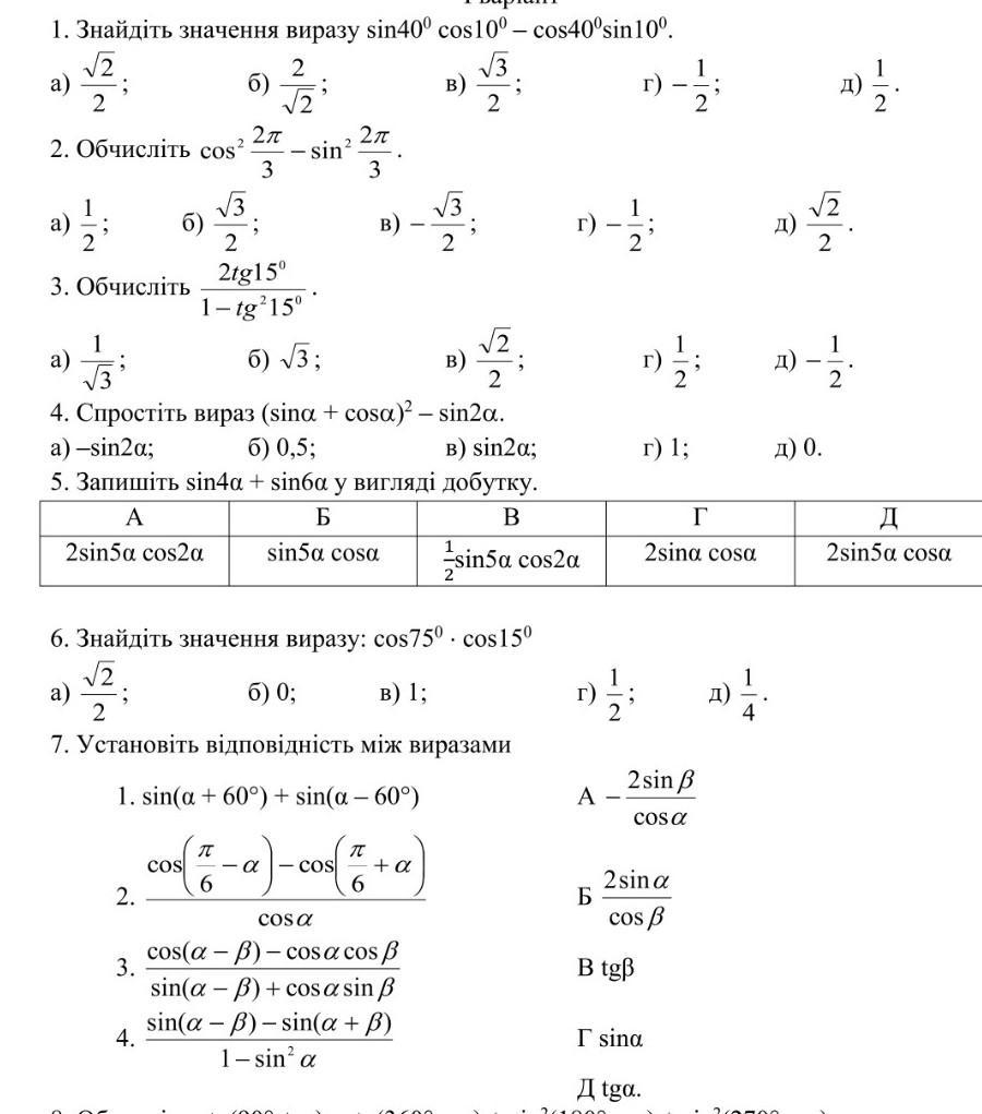 1) Д, 2) Г, 3) Б, 4)А, 5)Д, 6)Д, 7) 1 - Г, 2 - Д, 3 - В, 4 - А