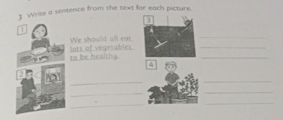 3 Write a sentence from the text for each picture. 2 1 We should all eat lots of vegetables to be healthy. 3 4