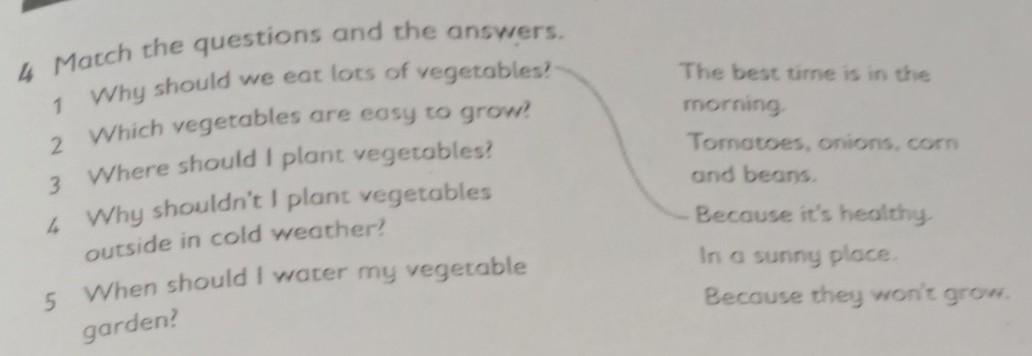 4 Match the questions and the answers. 1 Why should we eat lots of vegetables? Which vegetables are easy to grow? Where should I plant vegetables? 3 4 5 Why shouldn't I plant vegetables outside in cold weather? When should I garden? water my vegetable The best time is in the morning. Tomatoes, onions, corn and beans. Because it's healthy. In a sunny place. Because they won't grow.
