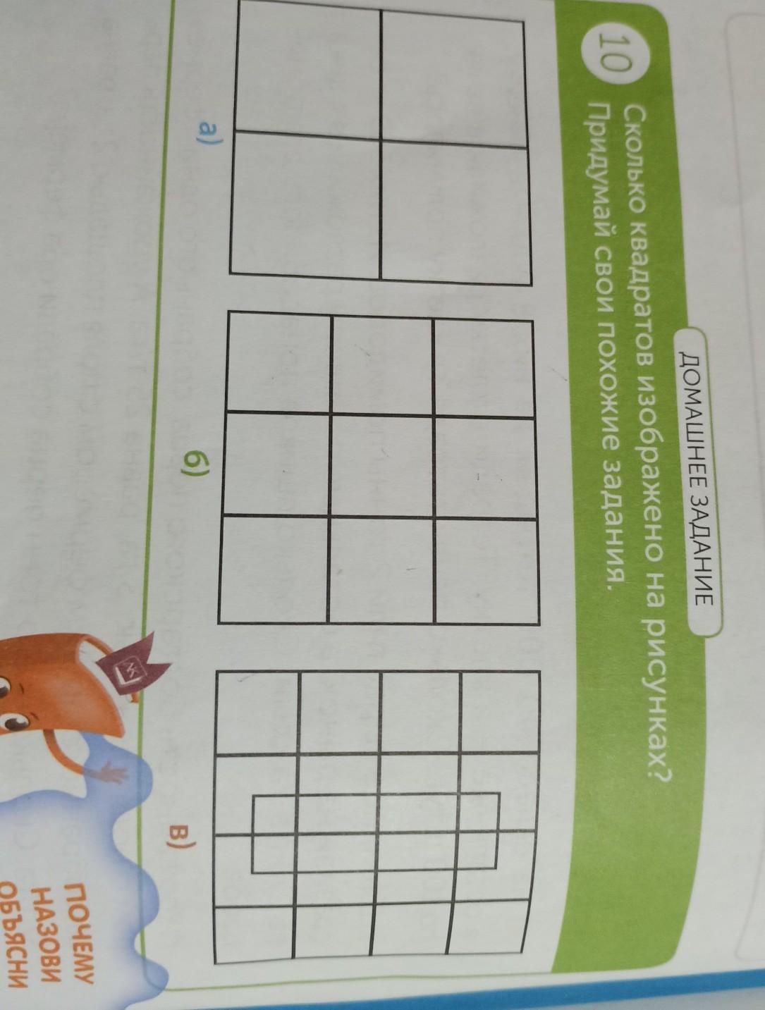 10 ДОМАШНЕЕ ЗАДАНИЕ Сколько квадратов изображено на рисунках? Придумай свои похожие задания. a) 6) NS B) ПОЧЕМУ