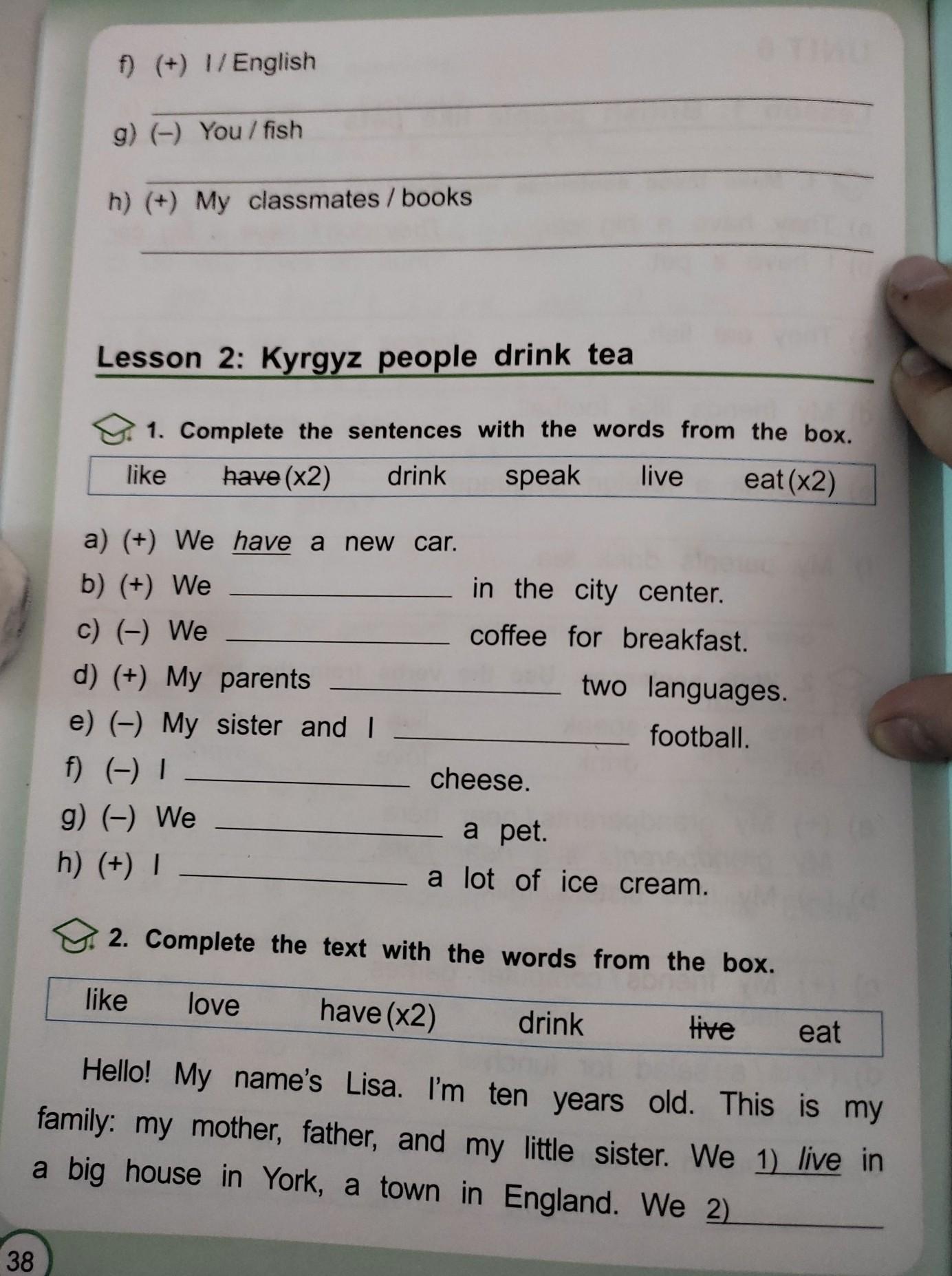 *) (*) 1/English g) (-) You/fish h) (+) My classmates/books 38 Lesson 2: Kyrgyz people drink tea 1. Complete the sentences with the words from the box. have (x2) drink speak live eat (x2) a) (+) We have a new car. b) (+) We c) (-) We d) (+) My parents e) (-) My sister and I g) (-) We h) (+) I in the city center. coffee for breakfast. cheese. two languages. football. a pet. a lot of ice cream. 2. Complete the text with the words from the box. like love have (x2) drink live eat Hello! My name's Lisa. I'm ten years old. This is my family: my mother, father, and my little sister. We 1) live in a big house in York, a town in England. We 2)