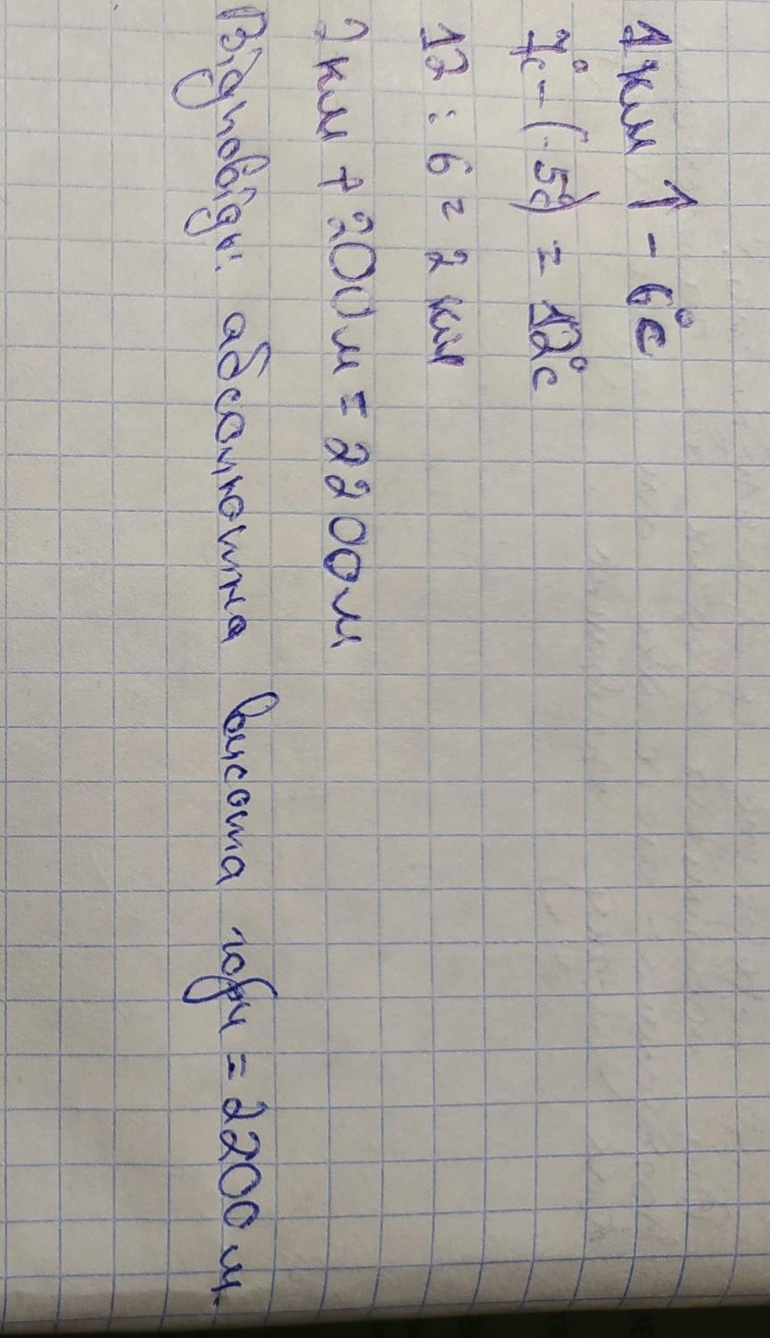 Температура повітря на вершині гори дорівнює -5 градусів, а біля її підніжжя на висоті 200 м над рівнем моря +7 градусів. Визначити абсолютну висоту гори. Будьласка допоможіть / пожалуйста помогите
