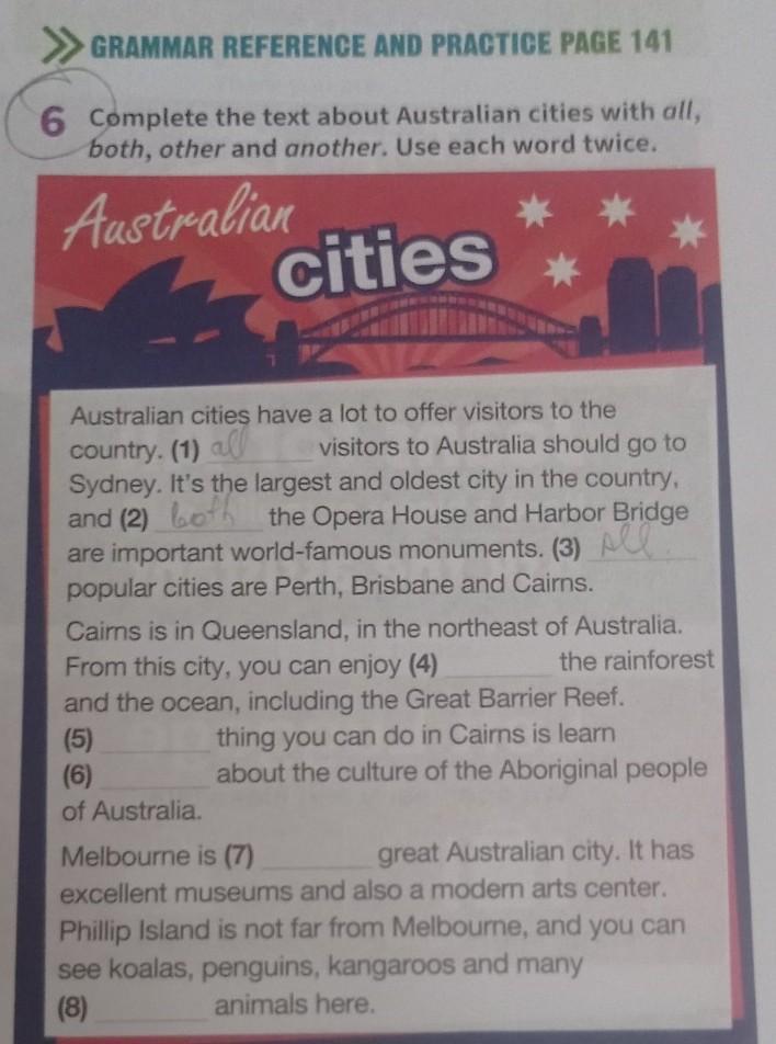 6 Complete the text about Australian cities with all, both, other and another. Use each word twice. Australian cities Australian cities have a lot to offer visitors to the country. (1) visitors to Australia should go to Sydney. It's the largest and oldest city in the country, and (2) the Opera House and Harbor Bridge are important world-famous monuments. (3) popular cities are Perth, Brisbane and Caims. Caims is in Queensland, in the northeast of Australia. From this city, you can enjoy (4) and the ocean, including the Great Barrier Reef. (5) (6) of Australia. the rainforest thing you can do in Cairns is learn about the culture of the Aboriginal people Melbourne is (7) great Australian city. It has excellent museums and also a modern arts center. Phillip Island is not far from Melbourne, and you can see koalas, penguins, kangaroos and many animals here. (8)