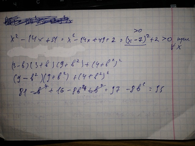 В первом скобка (х-7)^2 всегда больше нуля, следовательно если к ней прибавить 2, то тоже будет положительно при любых Х