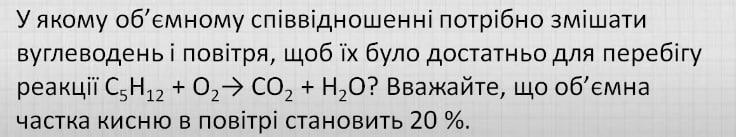 Об’ємне співвідношення вуглеводню та повітря, необхідне для реакції C5H12 + O2 → CO2 + H2O, залежить від стехіометричного співвідношення реагентів.