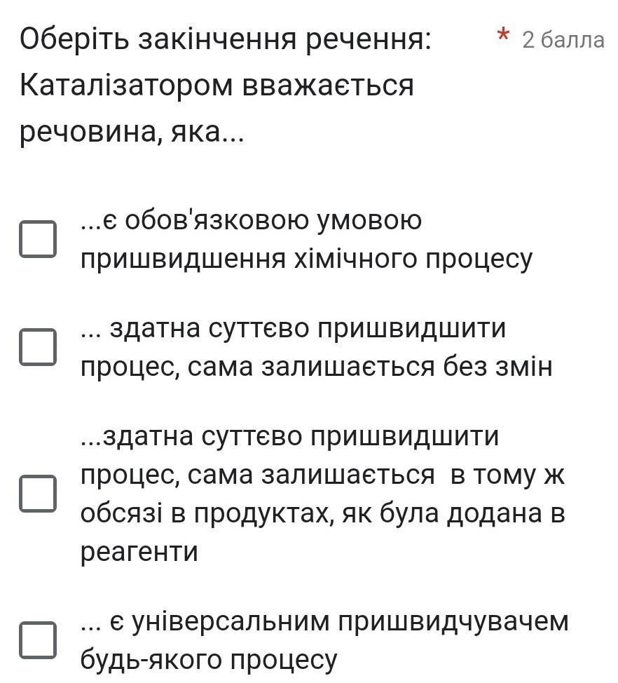 Объяснение: здатна суттєво пришвидшити процес, сама залишається в тому ж обсязі в продуктах, як була додана в реагенти.