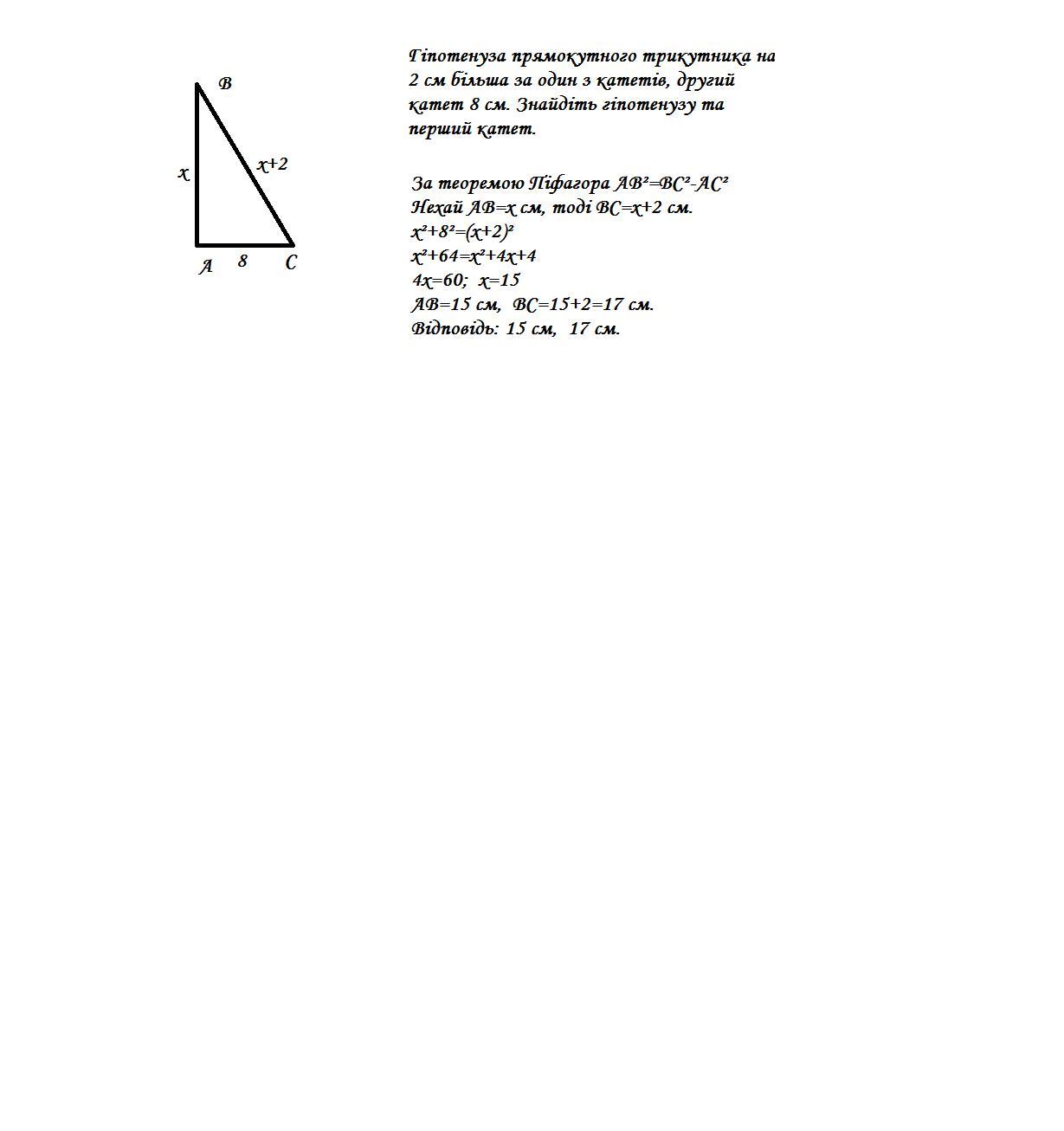 Гіпотенуза прямокутного трикутника на 2 сантиметрів більше за один з катетів, другий катет 8 сантиметрів. Знайдіть гіпотенузу та перший катет