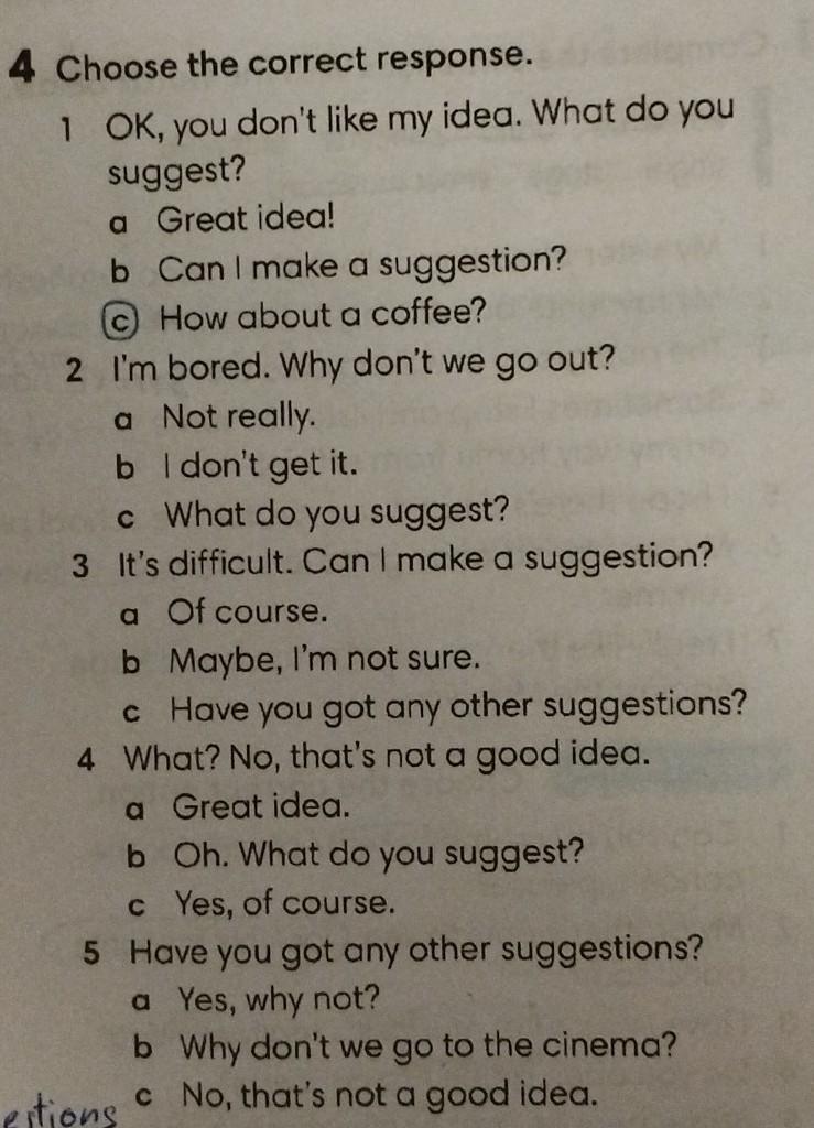 3 It's difficult. Can I make a suggestion? a Of course. b Maybe, I'm not sure. c Have you got any other suggestions?