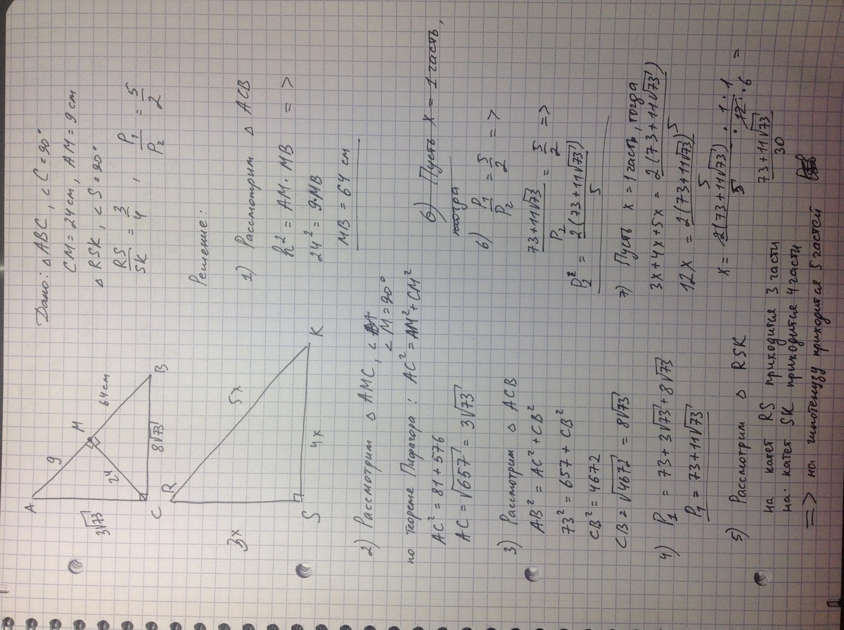 Даны два прямоугольных треугольника .Высота одного треугольника равна 24 см и делит гипотенузу на отрезки ,один из которых 9 см.В другом треугольники катеты относятся как 3:4.Отношение периметров данных треугольников равно 5:2.Найдите стороны второго треугольника