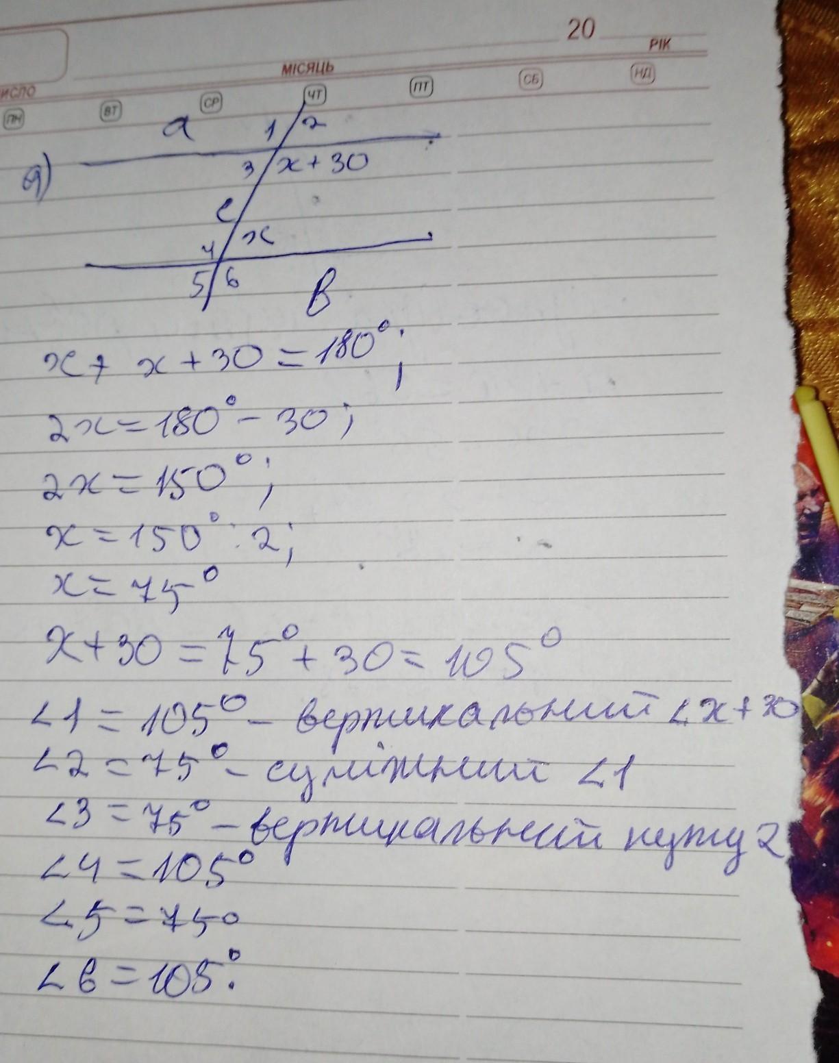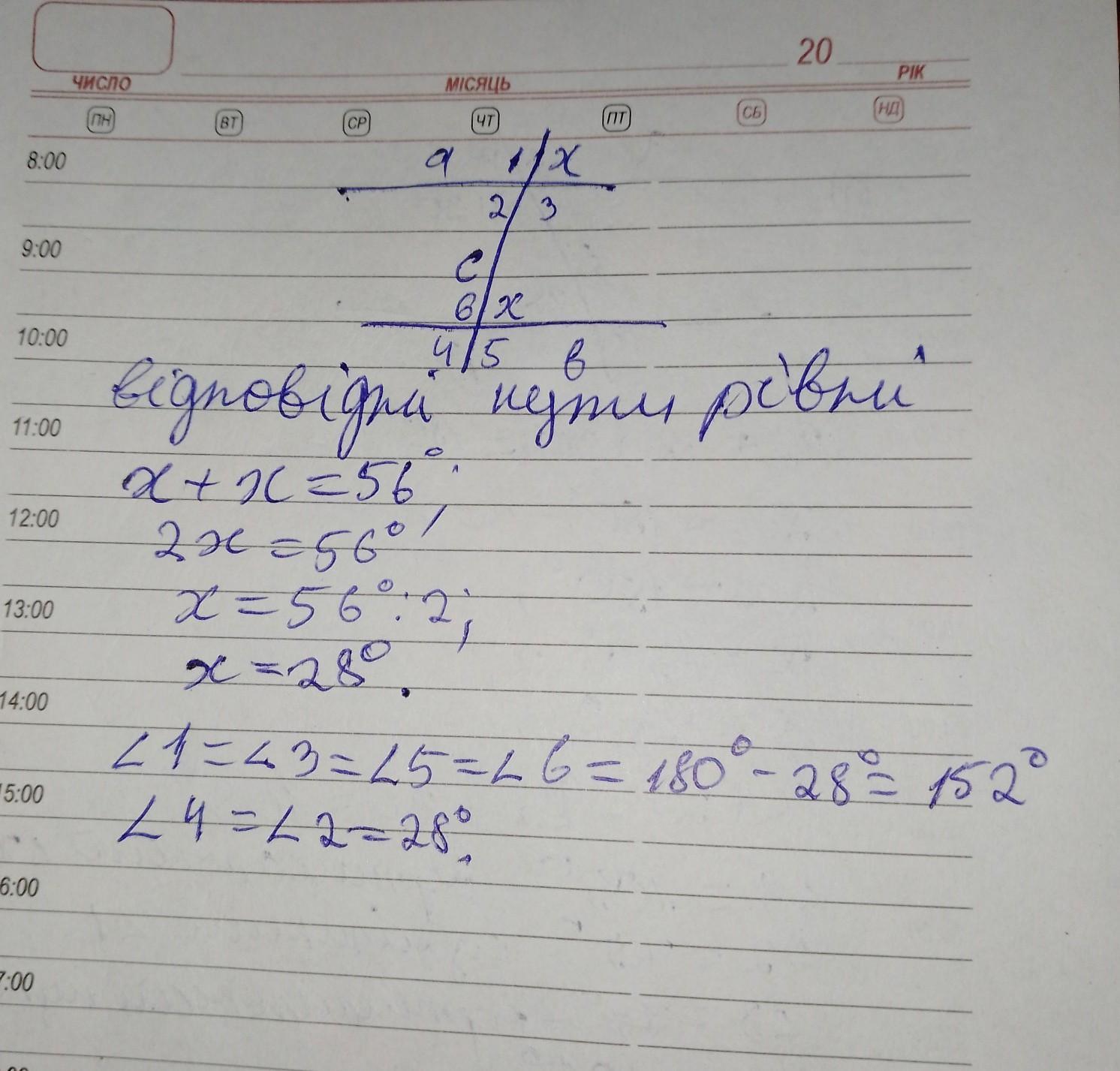 Знайдіть усі кути, утворені в результаті перетину двох пара- лельних прямих січною, якщо: a) один із внутрішніх односторонніх кутів на 30° більший, ніж другий; б) сума двох відповідних кутів дорівнює 56°.