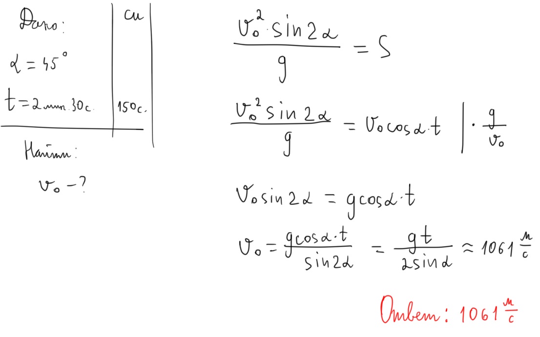 Артиллерист услышал звук разрыва снаряда, выпущенного под углом 450 к горизонту, через 2 мин 30 с после выстрела. Какова была начальная скорость снаряда?