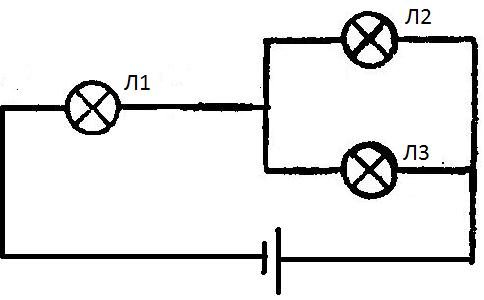 Три лампы с маркировкой Л1 (3 В, 3 Ом) , Л2 (2 В, 1 А) и Л3(3 В, 4,5 Вт) соединены по схеме на рисунке. Какое количество теплоты выделится на лампе Л3 за 1 минуту? Считать,что сопротивление ламп не зависит от температуры.
