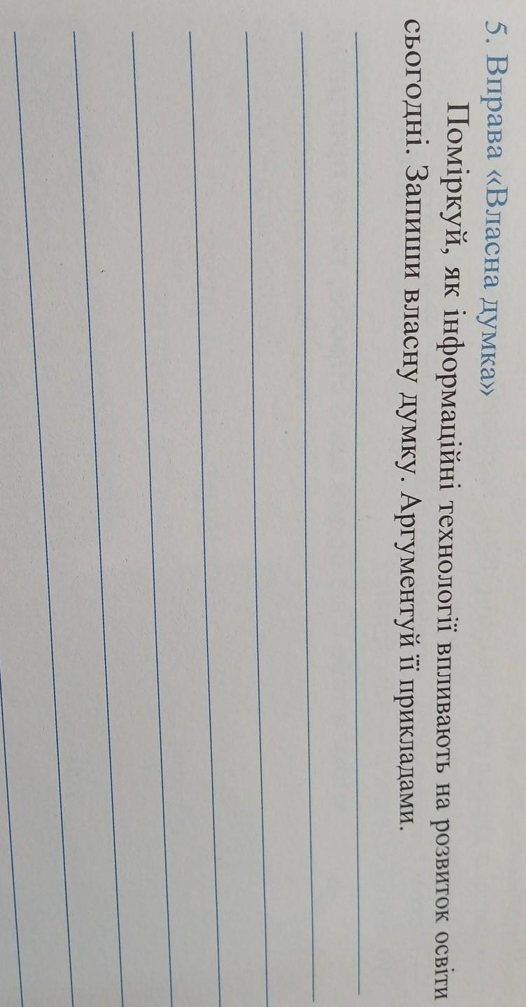 5. Вправа «Власна думка» Поміркуй, як інформаційні технології впливають на розвиток освіти сьогодні. Запиши власну думку. Аргументуй її прикладами.