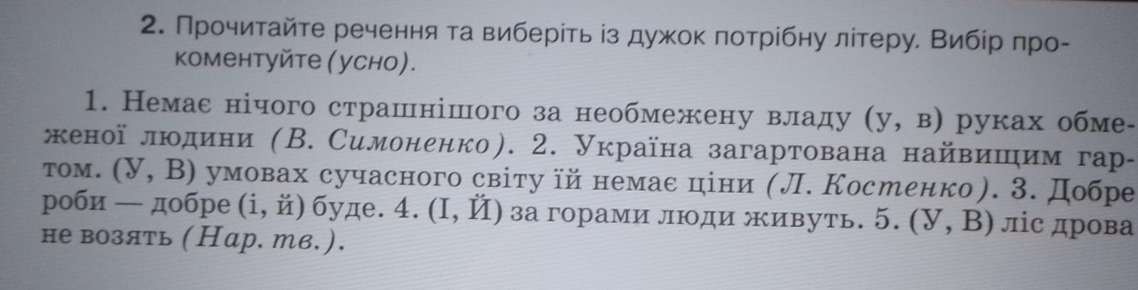 2. Прочитайте речення та виберіть iз дужок потрібну літеру. Вибір про- коментуйте (усно). 1. Немає нічого страшнішого за необмежену владу (у, в) руках обме- женої людини (В. Симоненко). 2. Україна загартована найвищим гар- том. (У, В) умовах сучасного світу їй немає ціни (Л. Костенко). 3. Добре роби - добре (і, й) буде. 4. (І, Й) за горами люди живуть. 5. (У, В) ліс дрова не возять (Нар. тв.).