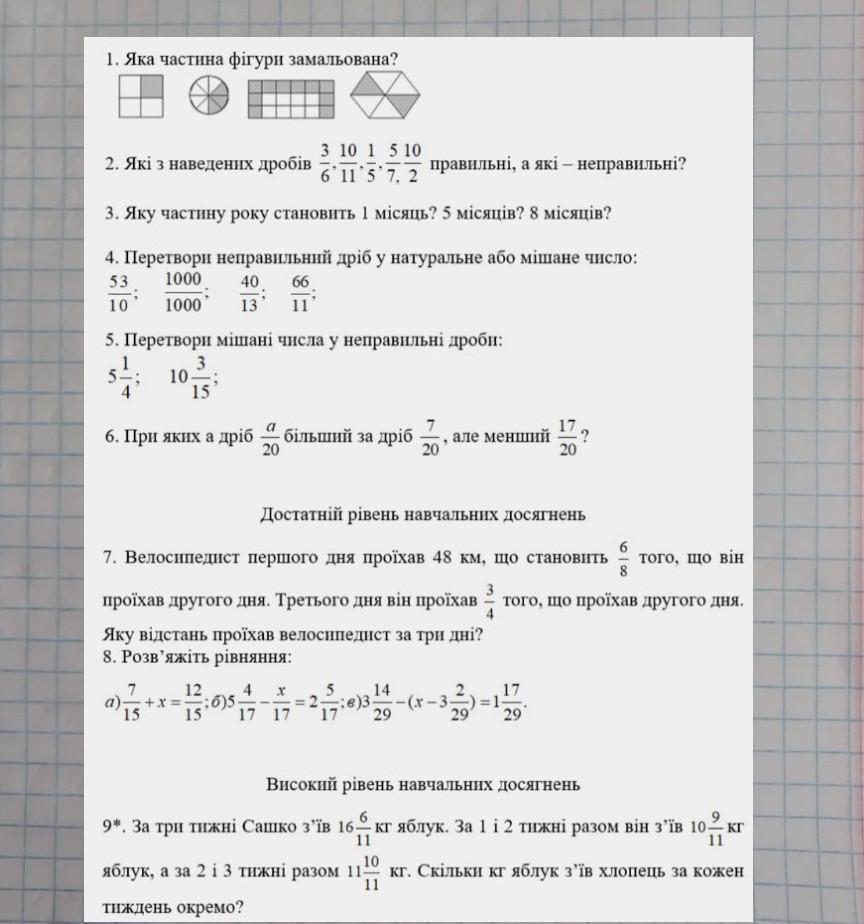 Ответ:1. 1/4 , 3/8 , 10/18 , 2/6 .2. 3/6 - правильне , 10/11 - правильне , 1/5 -правильне , 5/7 - правильне , 10/2 - неправильне .3. 1 місяць становить 1/12 року , 5 місяців 5/12 , 8 місяців 8/12 .4.5,3 , 1 , (третє я не знаю, вибачаюсь) , 11 .5.5/4 , 30/15 .6.а/20 менший , коли знаменник менше , більший , коли знаменник більше .Пошаговое объяснение:я все і так написала, аївххв