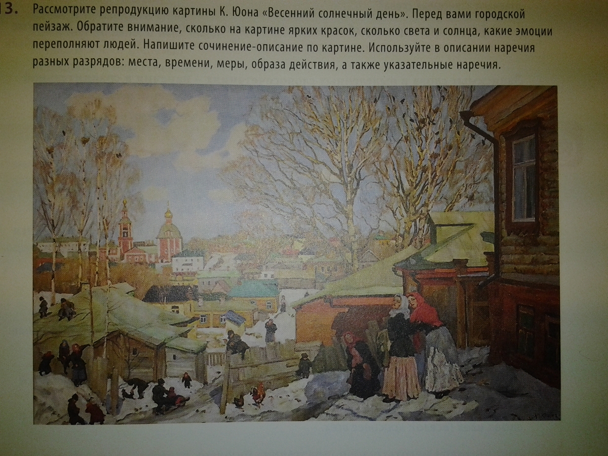 Можете, пожалуйста, помочь написать сочинение-описание по картине К. Юона "Весенний солнечный день", обращая внимание, сколько на картине ярких красок, сколько света и солнца, какие эмоции переполняют людей.