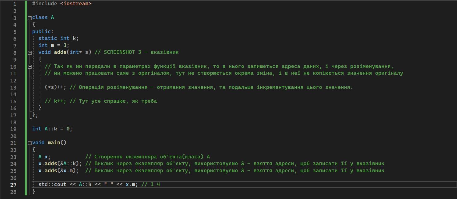 3) Якщо ти уж хочеш, щоб твій код працював правильно, треба його змінити(дивись скріни) Функція adds просто створює нову локальну зміну s, в яку КОПІЮЄТЬСЯ значення змінної, переданої аргументом функції adds при виклиці. Потім це значення збільшується, і видаляється з пам'яті. Щоб усе працювало як треба, параметром функції передай вказівник. Тоді в цей вказівний передавай адресу своєї зміної, і через розіменування, збільшуй саме значення цієї зміної(скріншот 3).