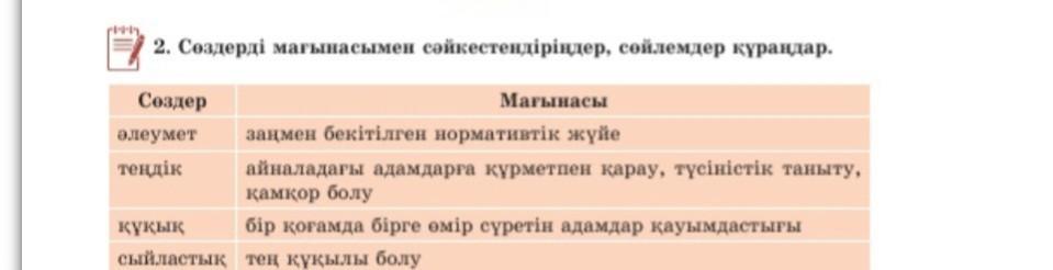 Сөздерді мағынасымен сәйкестендіріңдер, сөйлемдер құрандар. Сездер Әлеумет Магынасы занмен бекітілген нормативтік жүйе тендік айналадагы адамдарга курметпен қарау, түсіністік таныту, камкор болу бір когамда бірге өмір сүретін адамдар қауымдастығы кұкык сыйластык тең құқылы болу