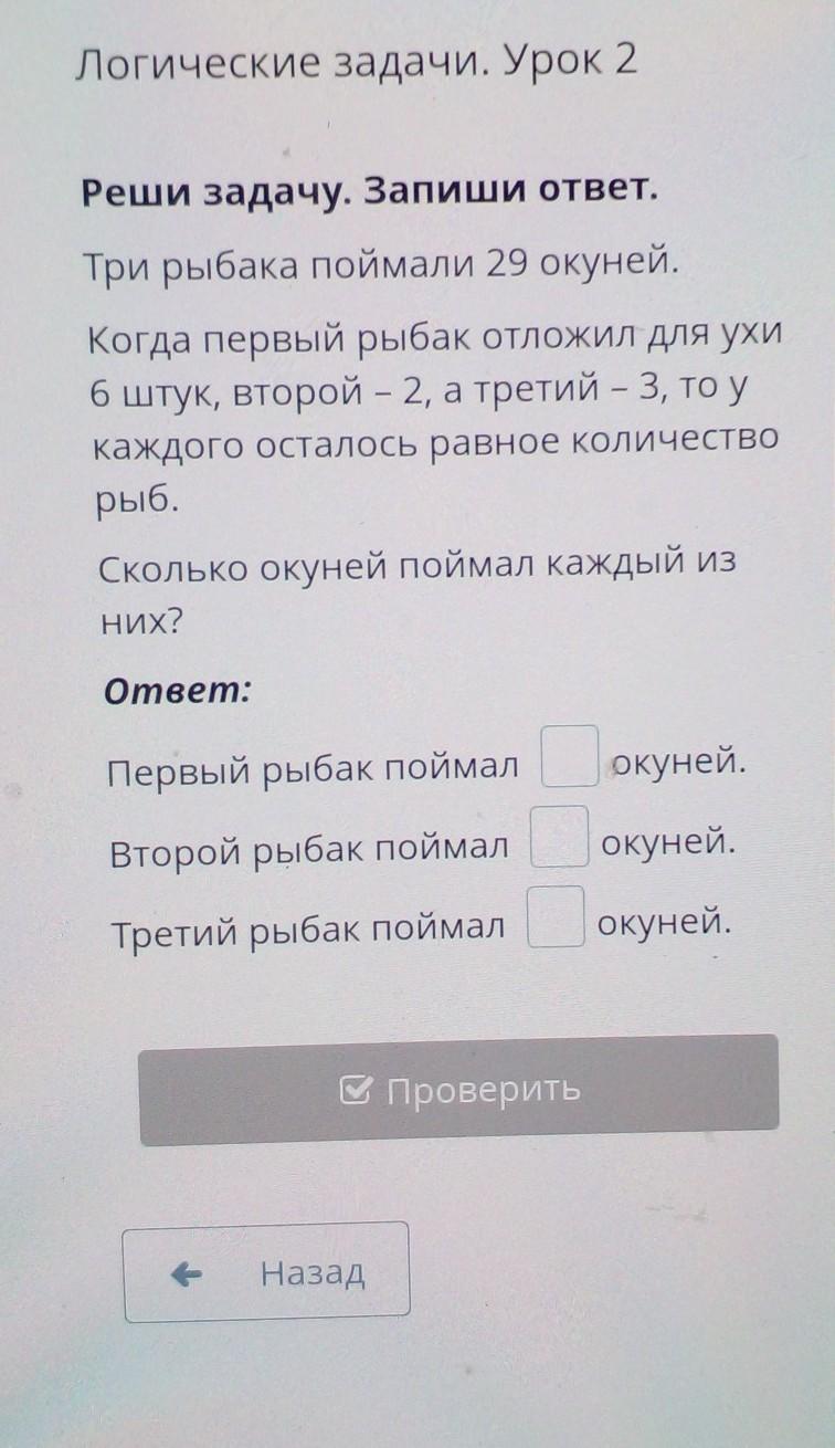 Логические задачи. Урок 2 Реши задачу. Запиши ответ. Три рыбака поймали 29 окуней. Когда первый рыбак отложил для ухи 6 штук, второй - 2, а третий - 3, то у каждого осталось равное количество рыб. Сколько окуней поймал каждый из них? Ответ: Первый рыбак поймал Второй рыбак поймал Третий рыбак поймал Проверить окуней. окуней. окуней.