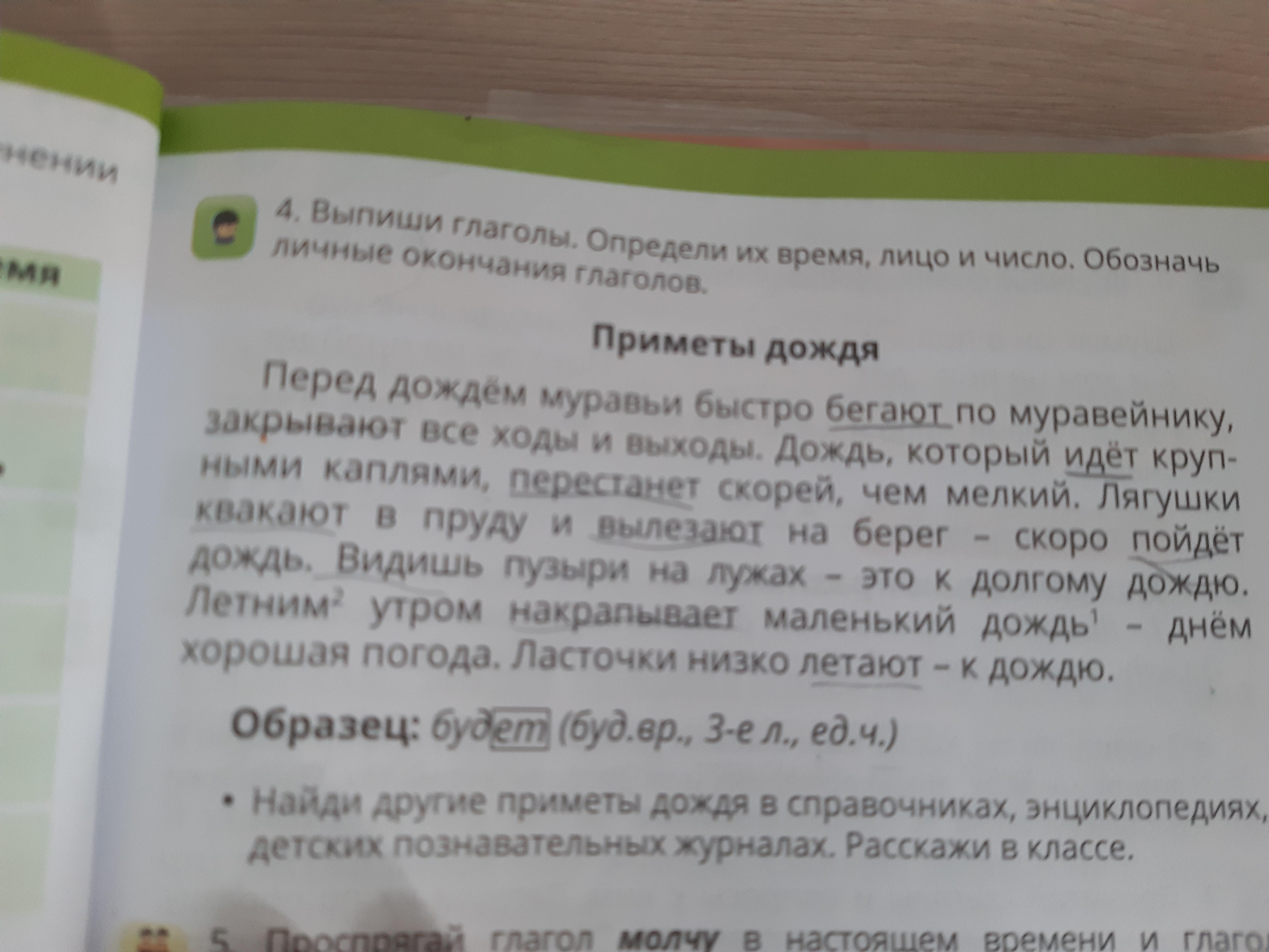 Выпиши глаголы. Определи их время лицо и число. Обозначь личные окончания.