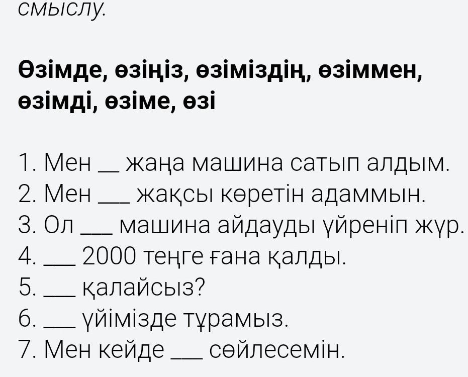 Өзімде, өзіңіз, өзіміздің, өзіммен, өзімді, өзіме, өзі 1. Мен 2. Мен 3. Ол 4. 5. қалайсыз? 6. үйімізде тұрамыз. 7. Мен кейде _ сөйлесемін. ▬▬▬▬▬▬▬▬▬▬▬▬▬▬▬▬▬▬▬▬▬▬▬▬▬▬▬▬ жаңа машина сатып алдым. жақсы көретін адаммын. машина айдауды уйреніп жүр. ▬▬▬▬▬▬▬▬▬▬▬▬▬▬▬▬▬▬▬▬▬▬▬▬▬▬▬▬▬ 2000 теңге ғана қалды.