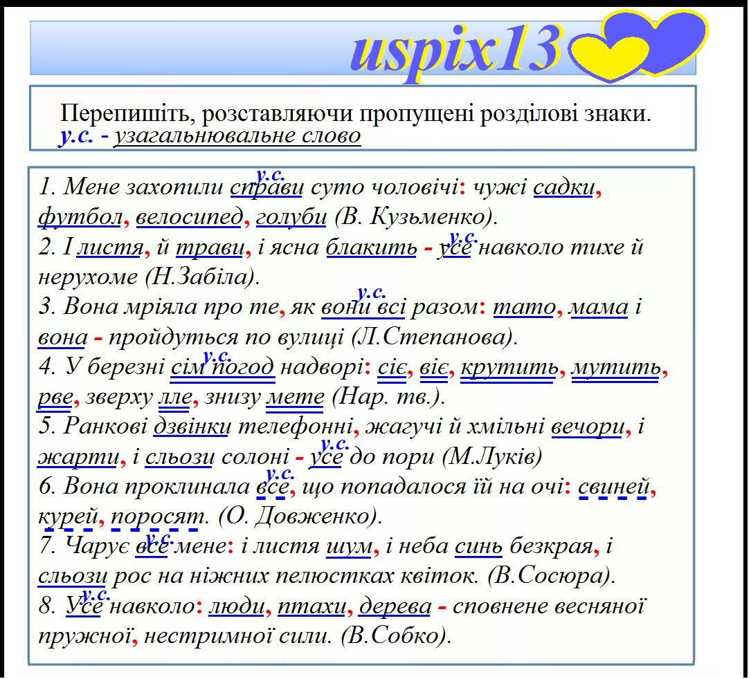 7. Чарує все мене і листя шум і неба синь безкрая і сльози рос на ніжних пелюстках квіток. (В.Сосюра).