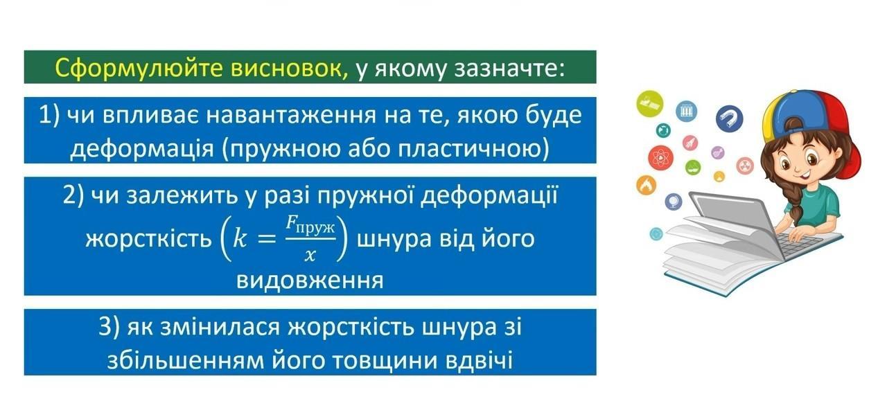 Сформулюйте висновок, у якому зазначте: 1) чи впливає навантаження на те, якою буде деформація (пружною або пластичною) 2) чи залежить у разі пружної деформації Fпруж шнура від його X видовження жорсткість ( k = 3) як змінилася жорсткість шнура зі збільшенням його товщини вдвічі.помогите пожалуйста