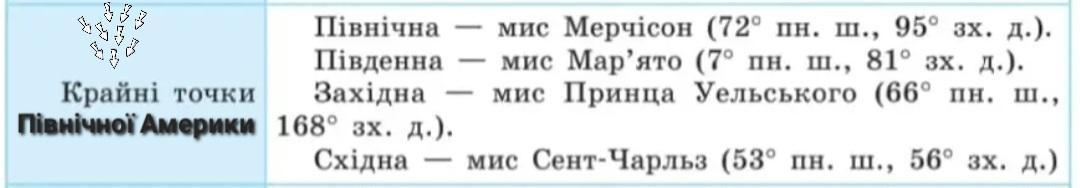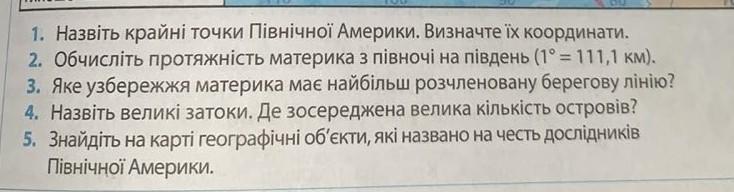 1. Назвіть крайні точки Північної Америки. Визначте їх координати. 2. Обчисліть протяжність материка з півночі на південь (1º = 111,1 км). 3. Яке узбережжя материка має найбільш розчленовану берегову лінію? 4. Назвіть великі затоки. Де зосереджена велика кількість островів? 5. Знайдіть на карті географічні об'єкти, які названо на честь дослідників Північної Америки. Поможіть хто може. Зарання дякую
