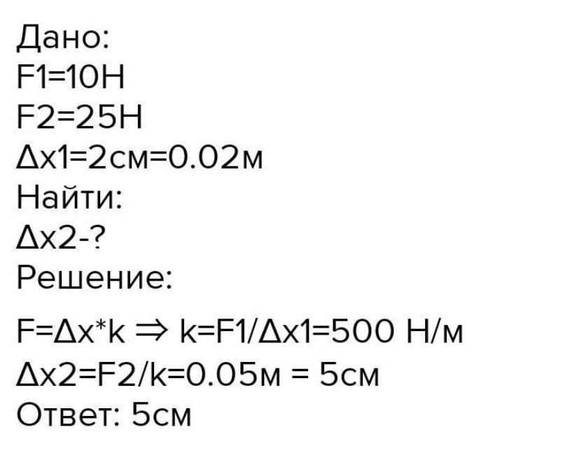 Під дією сили пружності 10Н пружина продовжилась на 3 мм. Знайти подовження пружини під дією сили 25Н