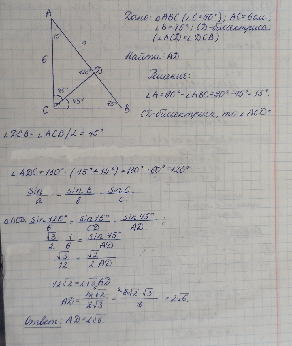 В треуrольнике АВС из вершины прямоrо уrла С проведена биссектриса CD. Найдите AD, если АС =6 и угол В = 75 градусов