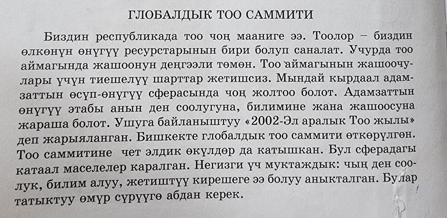 1. Бүгүнкү күндөгү ... .... ... төмөн экендиги айкындалды 2. Тоо жашоочулары үчүн тиешелүү ... жетишпейт. 3. ... ... ...2002 жылы Бишкекте өткөрүлдү. 4. ... ... ... да тоо саммитине катышты 5. Негизги максат ... .... ээ болуу. 6. Адамзаттын өсүп-өнүгүү анын жашоо шарттарына жараша болот.