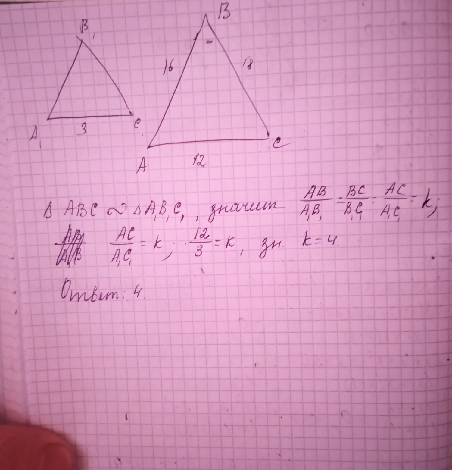 ДАЮ 100 БАЛОВ!!!!!СРОЧНО!!! ∆АВС~∆А,В,С1. Сторони трикутника ABC дорівнюють 12 см, 16 см, 18 см. Найменша сторона трикутника А,В,С1 дорівнює 3 см. Чому дорівнюЄ коефіцієнт подібності?