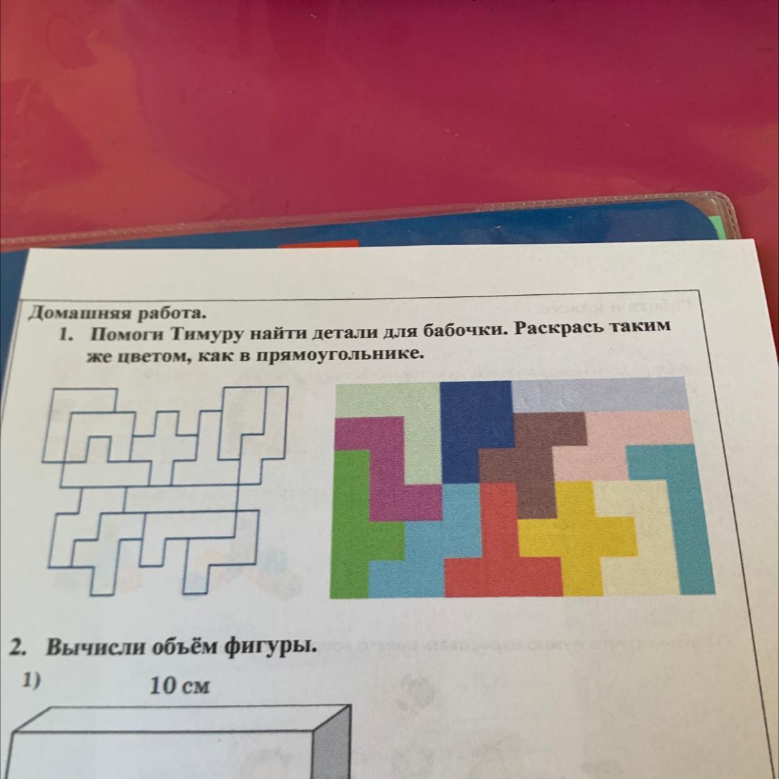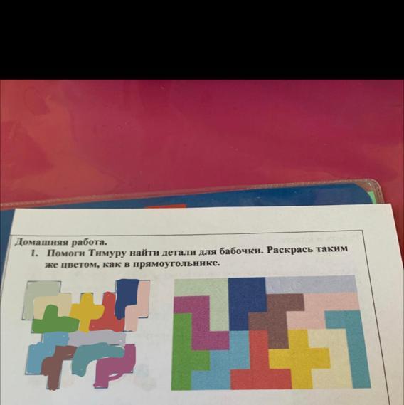 1. Помоги Тимуру найти детали для бабочки. Раскрась таким