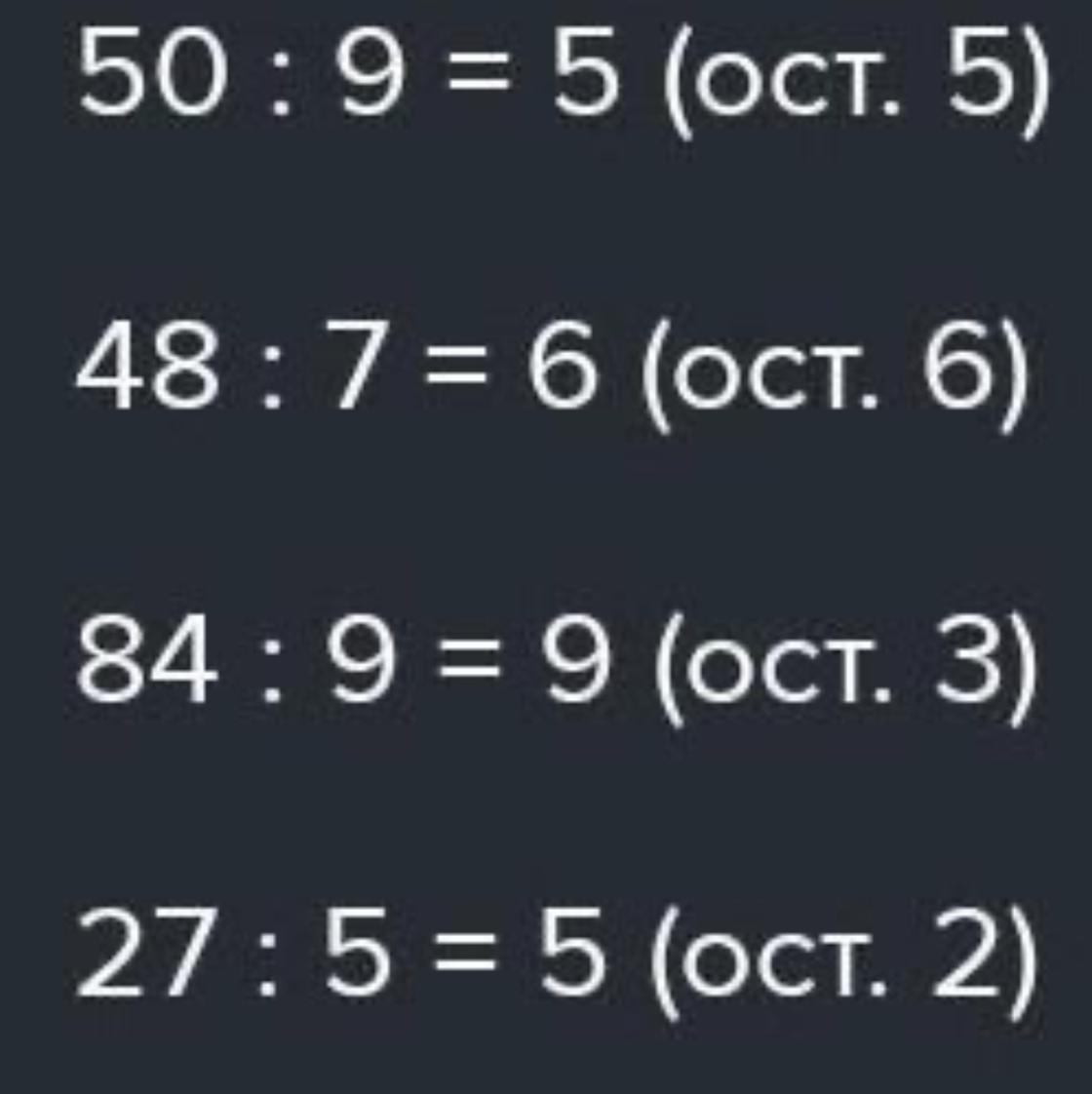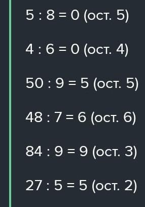 7. а) Выполни деление с остатком 5:8=0(ост 5) 8*0+5=5 4:6=0(ост 4) 6*0+4=4 50:9=5 (ост 5) 9*5+5=50 48:7=6 (ост 6) 6*7+6=42+6=48 84:9=9 (ост 3) 9*9+3=84 27:5=5 (ост 2) 5*5+2=27