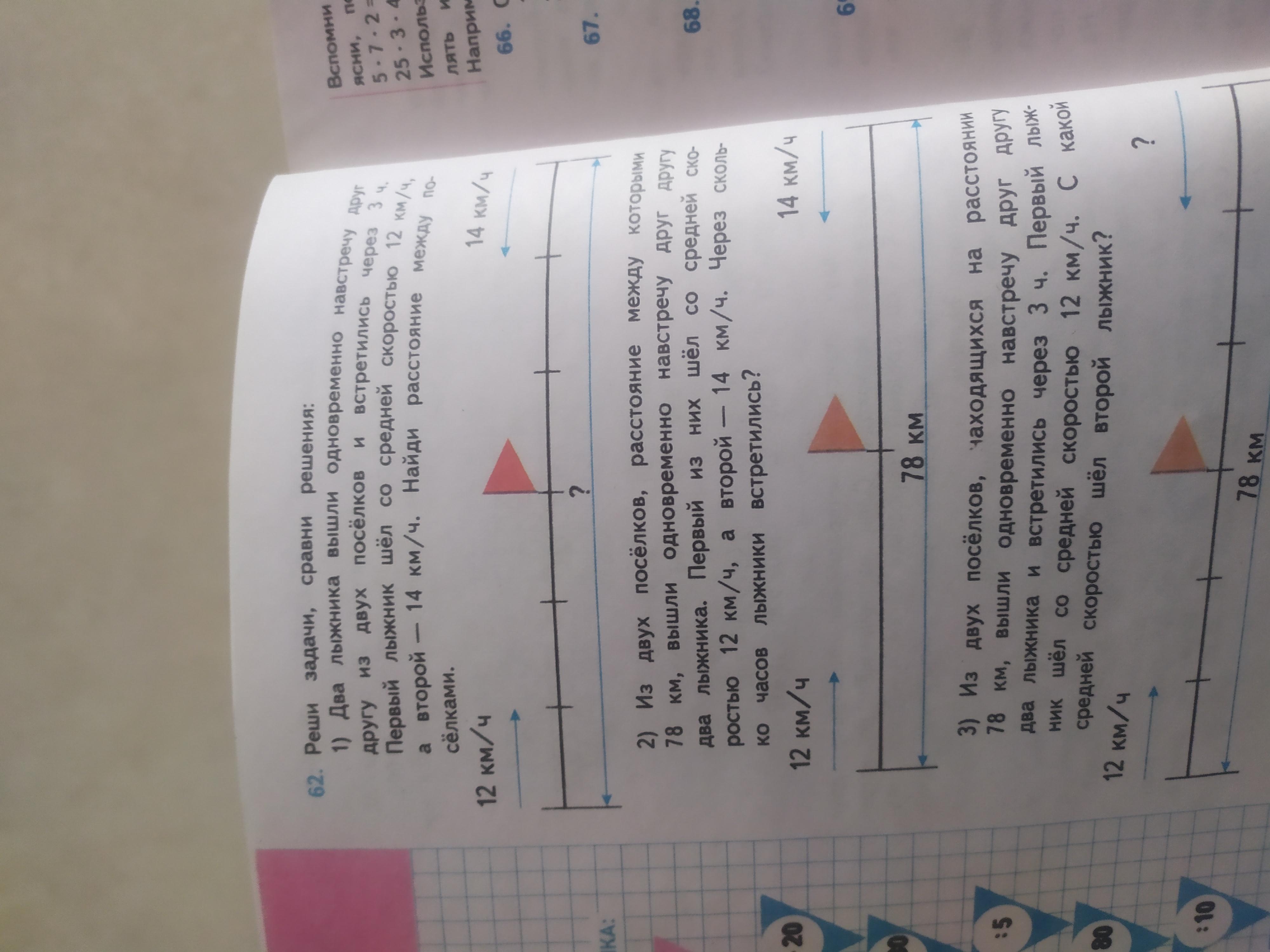 12+14=26 км/час скорость сближения лыжников 26*3=78 км расстояние между поселками