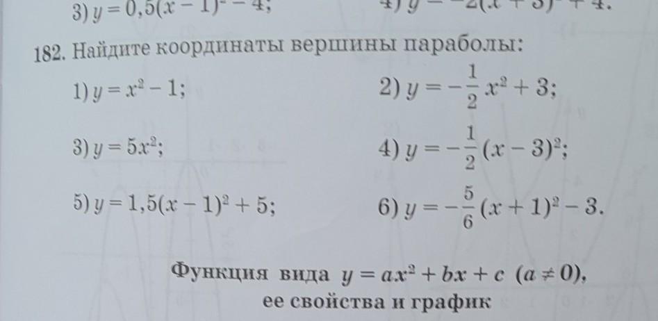 182. Найдите координаты вершины параболы: 1) y = x² – 1; 1 =-²/2x² + 3; 3) y = 5x²; - 5) y = 1,5(x - 1)2 + 5; = 2) y = 1 4) y = -- (x - 3)2; 2 5 6) y = − ² (x + 1)² − 3. -