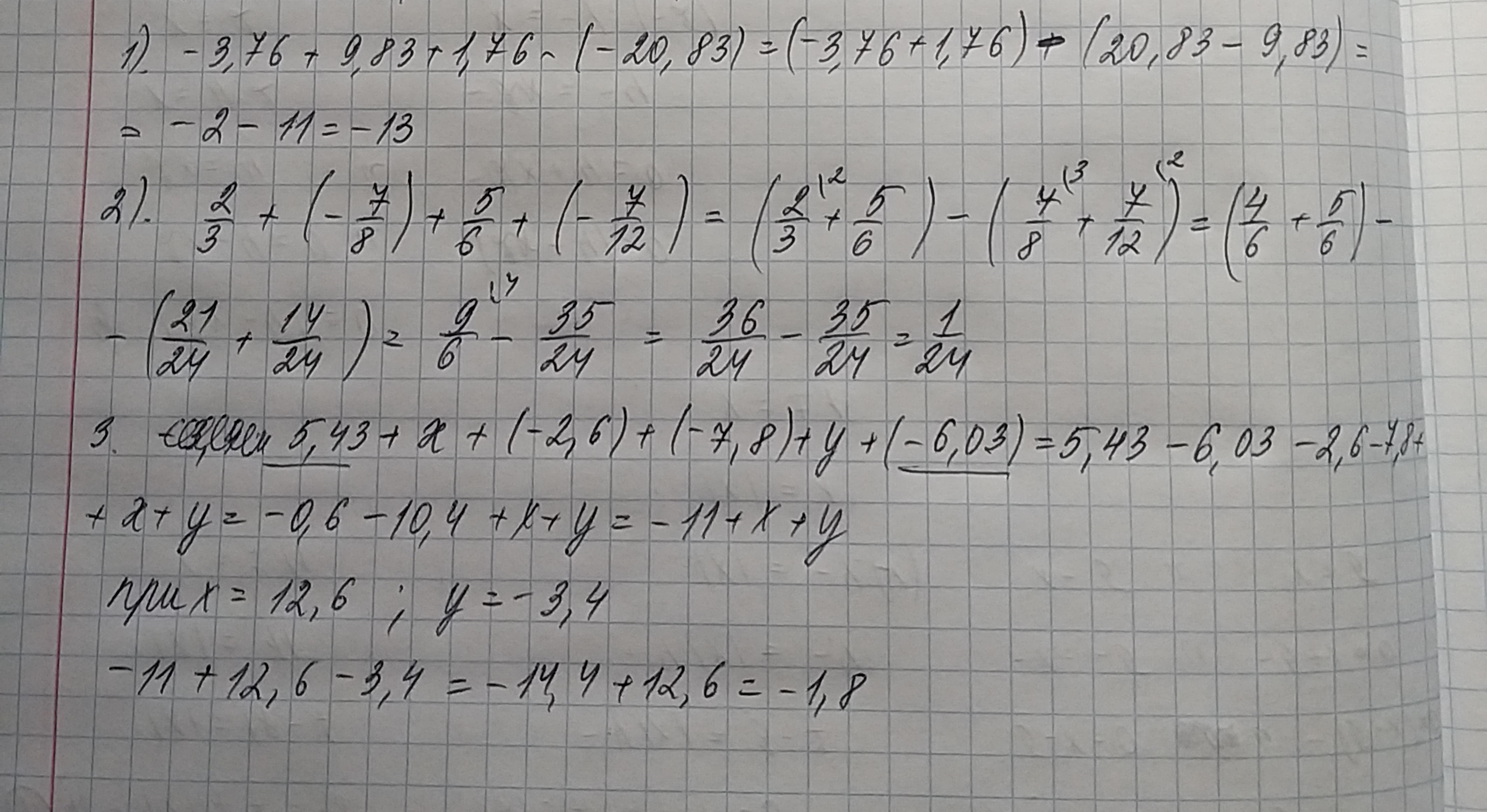 3. Спростіть вираз і знайдіть його значення при x = 12,6; y= -3,4: 5,43 + x + (-2,6) + (-7,8) + y + (-6,03)