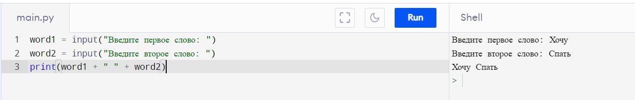 Даны два слова. Выведи их в одну строчку, разделив пробелом.