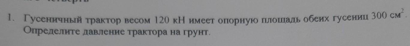 1. Гусеничный трактор весом 120 кН имеет опорную площадь обеих гусениц 300 см² Определите давление трактора на грунт.