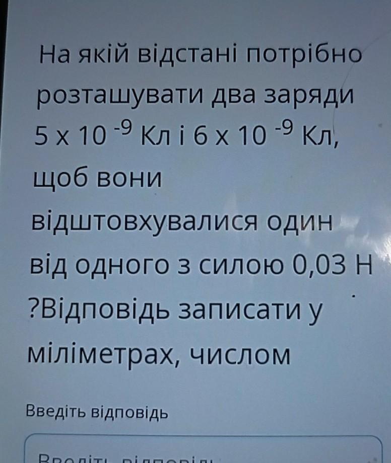 r=√(k*|q1|*|q2|/F)=√(9*10⁹*5*10⁻⁹*6*10⁻⁹/0,03)=3*10⁻³м=3мм