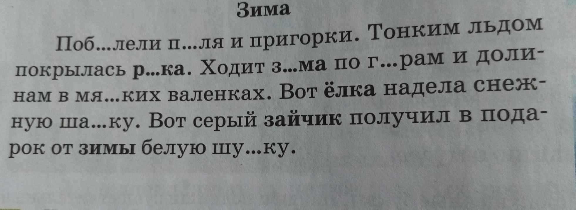 Побел`ели (б`елый) поля (мн.ч., И.п.) и пригорки (мн.ч., И.п). Тонким льдом (ед.ч., муж.р., Т.п.) покрылась рек`а (р`еки, ед.ч., жен.р., И.п.). Ходит зим`а (з`имы, ед.ч., жен.р., И.п.) по гор`ам (г`оры, мн.ч., Д.п.) и долинам (мн.ч., Д.п.) в мягких (мягок) валенках (мн.ч., П.п.). Вот ёлка (ед.ч., жен.р., И.п.) надела снежную шапку (шапочка, ед.ч., жен.р, В.п.). Вот серый зайчик (ед.ч., муж.р., И.п.) получил в подарок (ед.ч., муж.р., В.п.) от зимы (ед.ч., жен.р., Р.п.) белую шубку (шуба, ед.ч., жен.р., В.п.).