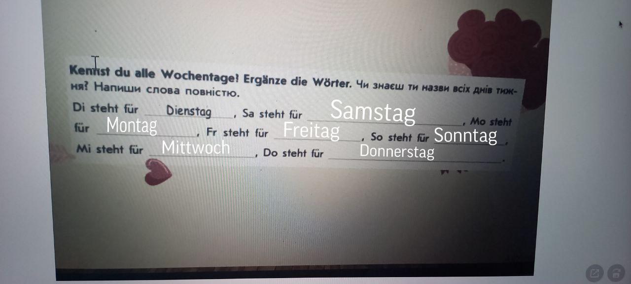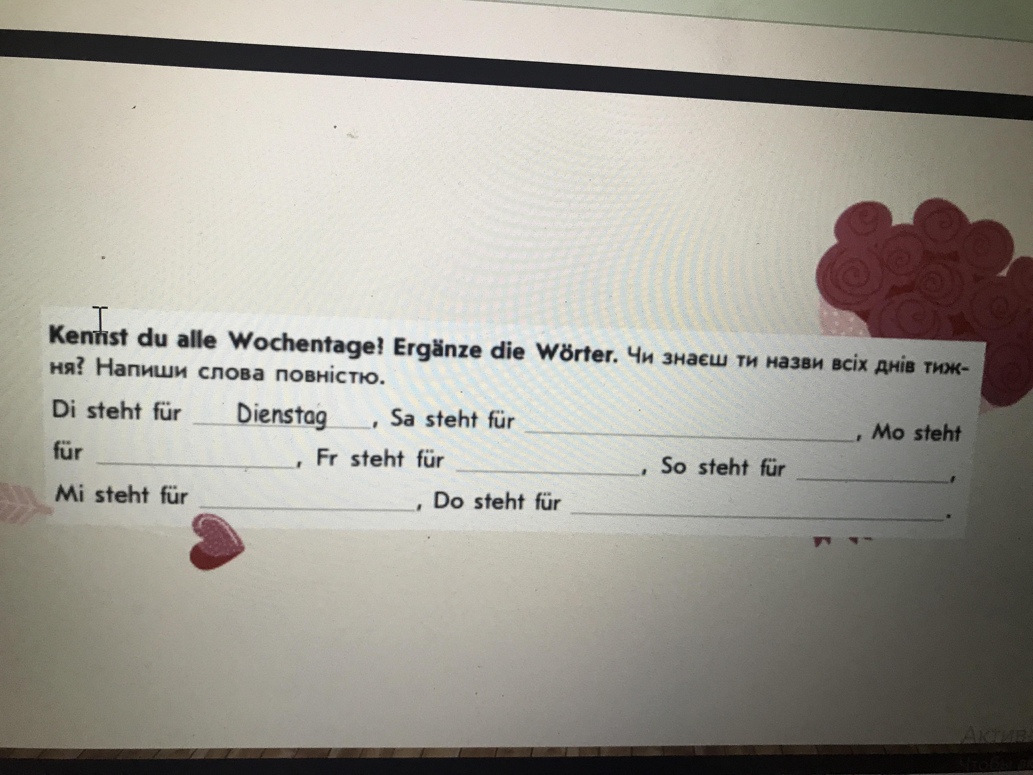 Di steht für Dienstag, Sa steht für Samstag, Mo steht für Montag, Fr steht für Freitag, So steht für Sonntag, Mi steht für Mittwoch, Do steht für Donerstag.