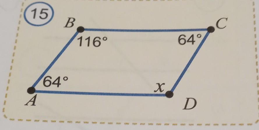 1-й способ. Как известно, сумма углов в четырехугольнике равна 360°. Поэтому x+64+116+64=360; x+244=360; x=360-244; x=116.