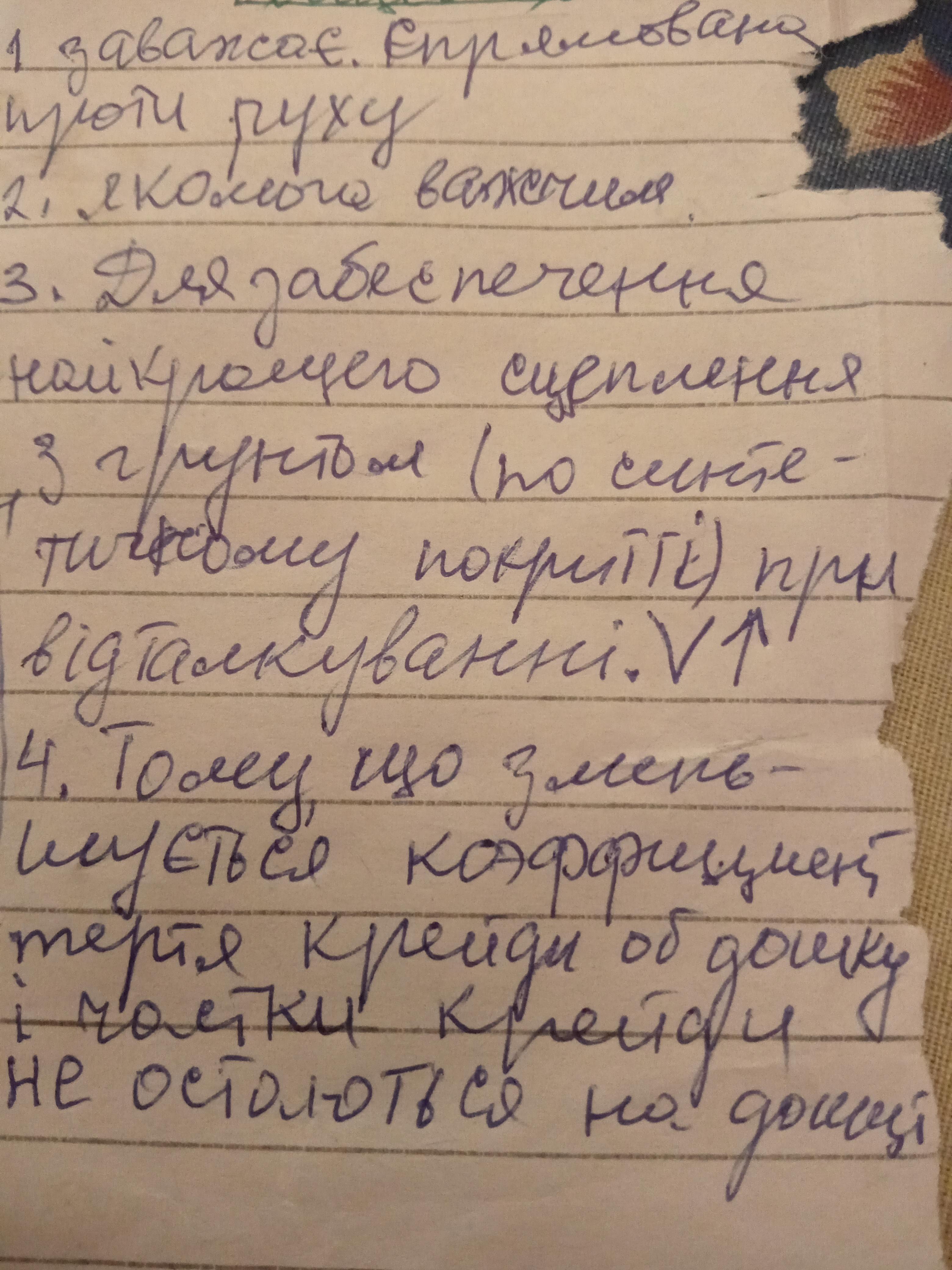 БУДЬ ЛАСКА ДУЖЕ ТЕРМІНОВО!!! ДАМ 80 БАЛІВ !!!! 1. Автомобіль ïде по дорозі . Допомагає чи заважає йому рухатися сила тертя ? 2. щоб тягти важкий товарний потяг , локомотив має бути якомога легшим чи важчим ? 3. Навіщо бігуни на короткі відстані взувають взуття з шипами ? 4. Чому важко писати крейдою по мокрій дошці ?