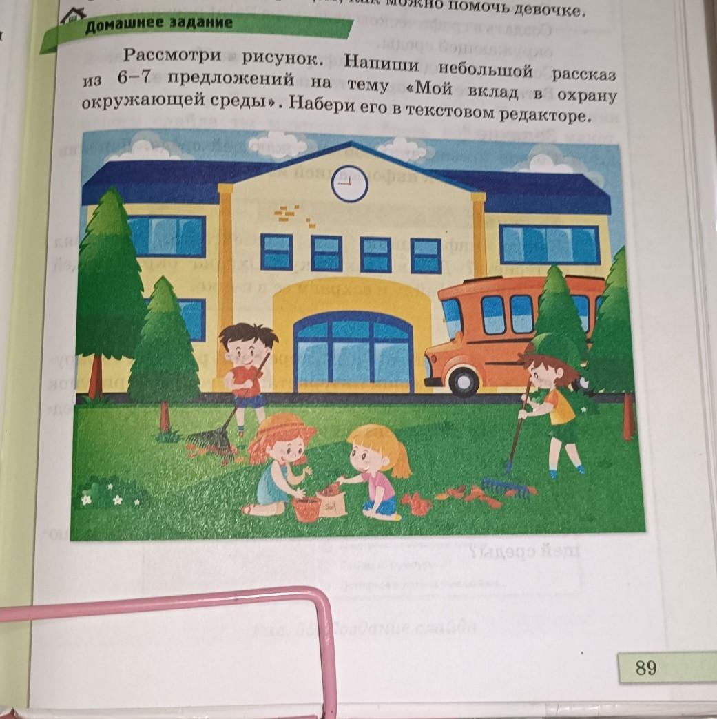 Домашнее задание Рассмотри рисунок. Напиши небольшой рассказ из 6-7 предложений на тему «Мой вклад в охрану окружающей среды». Набери его в текстовом редакторе.