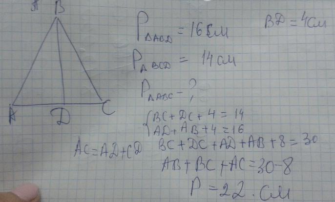 Треугольник ABD имеет периметр 16 см, треугольник BCD имеет периметр 14 см. Обведите периметр треугольника ABC, если BD = 4 см!